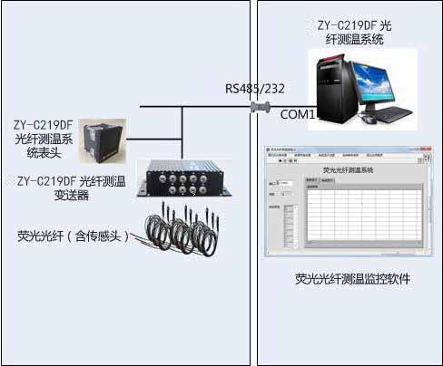 該系統由熒光光纖(含傳感頭)、YG-C206 光纖測溫變送器、熒光光纖通